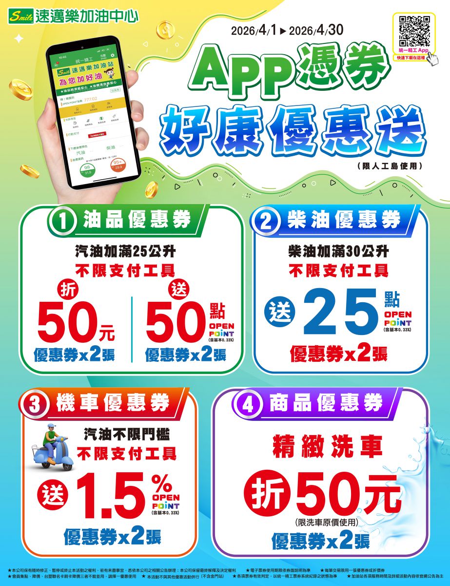 ❶ 汽油單筆加滿 25 公升,出示並掃碼統一精工會員 APP 降價優惠券,享折扣50元。