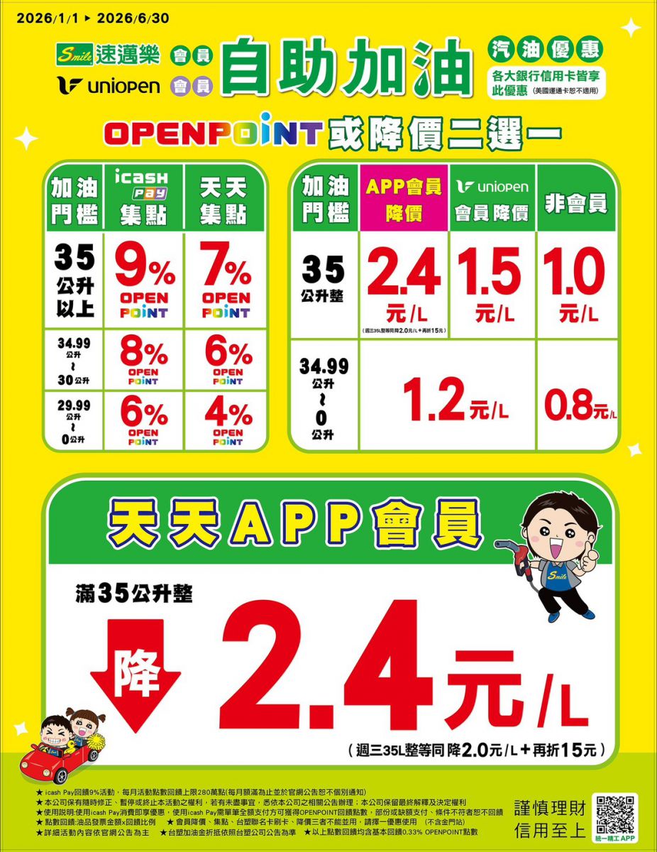 ,天天汽油加滿 30-34.99公升,降1.2元/公升,或回饋 OPENPOINT 點數 6%。