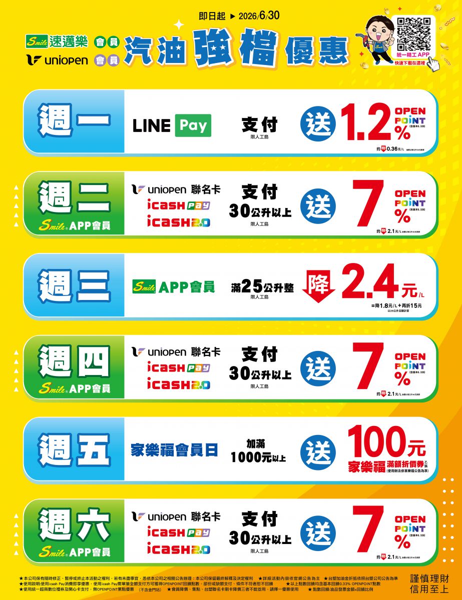 加碼優惠:本活動交易金額僅限一般商品交易,不適用自動加值、現金加值、儲值類交易、自助加油(非定額加滿油)、菸類商品、繳稅/費及代收代售項目、OPENPOINT點數折抵金額。本活動之消費認定將依實際交易金額及發票為主,加碼回饋之OPENPOINT計算至小數點後第二位 (依小數點後第三位四捨五入計算)。如交易經取消、退貨及退款,將不予贈點,若於活動贈點發送後退貨(包含部分退貨),將會追回以該筆交易計算之全額活動點數。